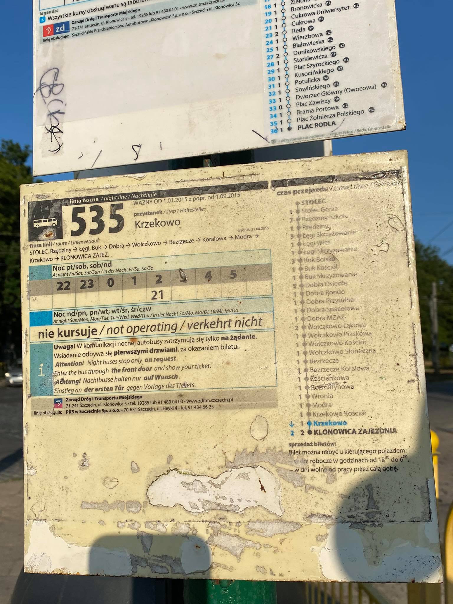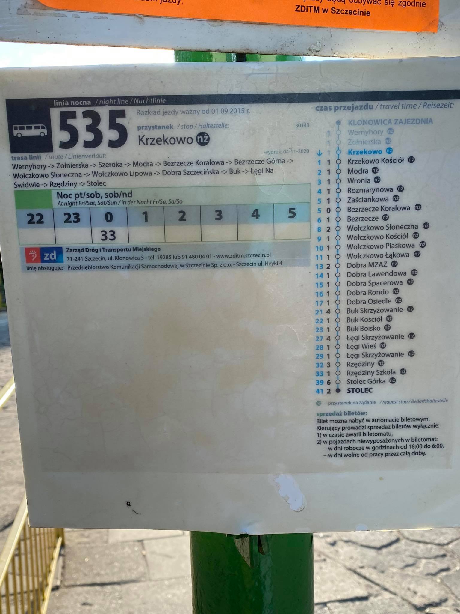 na pętli Krzekowo na przystanku autobusowym panuje chaos informacyjny. Linie 74, 105 oraz 535 mają wywieszone po dwa rozkłady jazdy, z których każdy przedstawia inny rozkład. W przypadku linii 74 chociaż rozkłady różnią się to posiadają na obu kompletach te same daty wskazujące od kiedy rozkład jest ważny i kiedy był jego wydruk. Rozkłady linii 105 mają wskazane te same daty od kiedy obowiązują. Te błędy wskazują na brak staranności przy opracowywaniu wydruków i zero kontroli nad tym co się dzieję w zakresie publikowanych rozkładów. Dodatkowo rozkład 74 jest w formie wyjątkowo skomplikowanej z podziałem na 5 różnych okresów w roku, gdzie czasami różnice w kursowaniu autobusów dotyczą dosłownie 2 lub 3 autobusów na całą dobę. Jest to forma komunikacji pasażerskiej wyjątkowo nieprzyjazna dla pasażera.