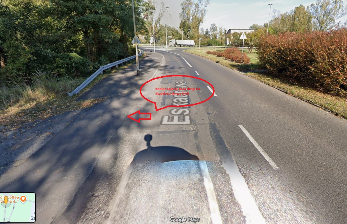 Nadmieniam, że nie jest możliwe bezpieczne poruszanie się rowerem po pasie z nawierzchnią bitumiczną, który historycznie był prawdopodobnie chodnikiem na tym odcinku. Wynika to z faktu wieloletnich zaniedbań w konserwacji i bieżącym utrzymaniu tego odcinka. Nawierzchnia jest tu zdewastowana przez korzenie topoli rosnących w skrajni jezdni; szerokość tego pasa jest niewystarczająca dla ruchu rowerowego; a ponadto w świetle tego pasa zlokalizowanych jest siedem latarni oświetlenia ulicznego, przystanek autobusowy (Most Cłowy 70111) linii 73 oraz drogowskaz tablicowy (znak E-2a).