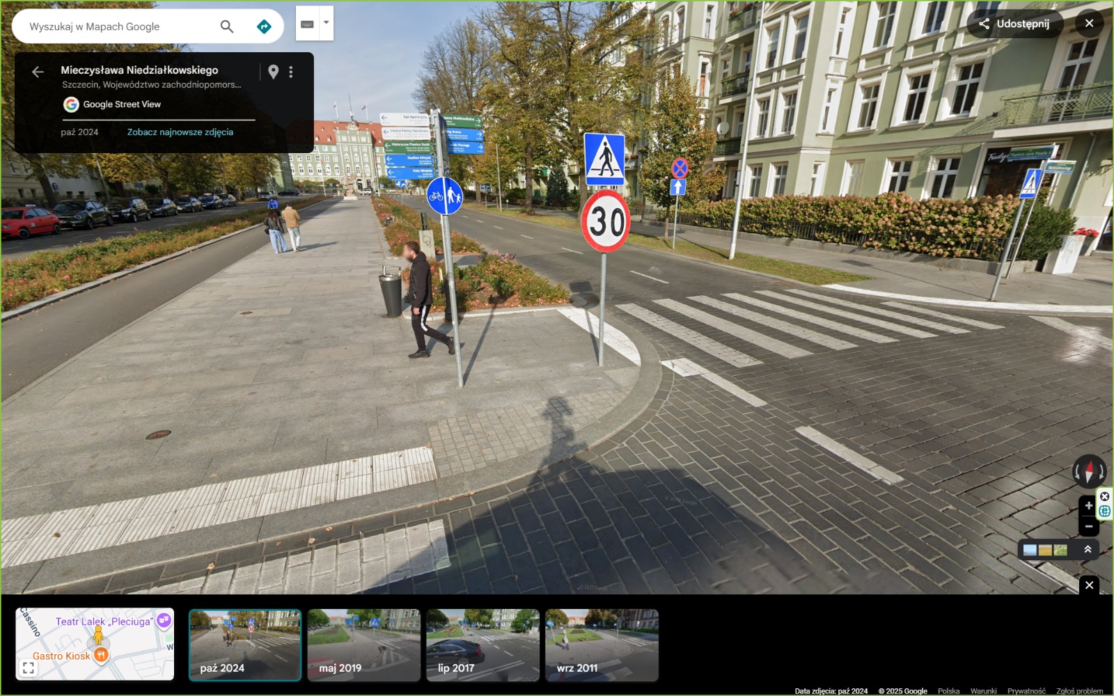 W powyższej lokalizacji znajduje się znak B-33 ograniczający prędkość do 30 km/h, ustawiony wyłącznie po lewej stronie jezdni. Z moich ustaleń wynika, że znak ten został najprawdopodobniej pozostawiony po prowadzonych wcześniej pracach remontowych lub czasowej zmianie organizacji ruchu. Analiza zdjęć dostępnych w usłudze Google Street View (zrzuty ekranu załączam) wskazuje, że w sierpniu 2024 r. znak B-33 w tej lokalizacji nie występował, natomiast w październiku 2024 r. był już ustawiony, przy czym brak jest w usłudze Google Street View widocznych śladów robót drogowych uzasadniających jego wprowadzenie w stałej organizacji ruchu (co nie znaczy wcale, że wprowadzono go niepotrzebnie). Może on jednak stanowić pozostałość po pracach, o których w sposób lakoniczny informował Zarząd Dróg i Transportu Miejskiego w komunikacie z dnia 2 września 2024 r., dotyczącym czasowego wyłączenia przystanku „Urząd Miasta” (https://wiadomosci.szczecin.eu/artykul/komunikacja/przystanek-urzad-miasta-12511-wylaczony).