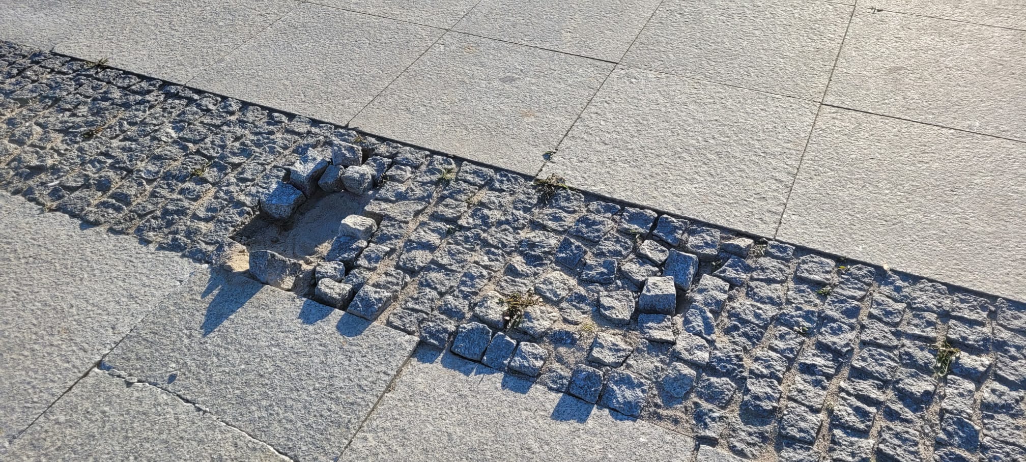• brakujące płyty granitowe z odsłoniętym podłożem – niezabezpieczone, stanowiące bezpośrednie zagrożenie dla pieszych;