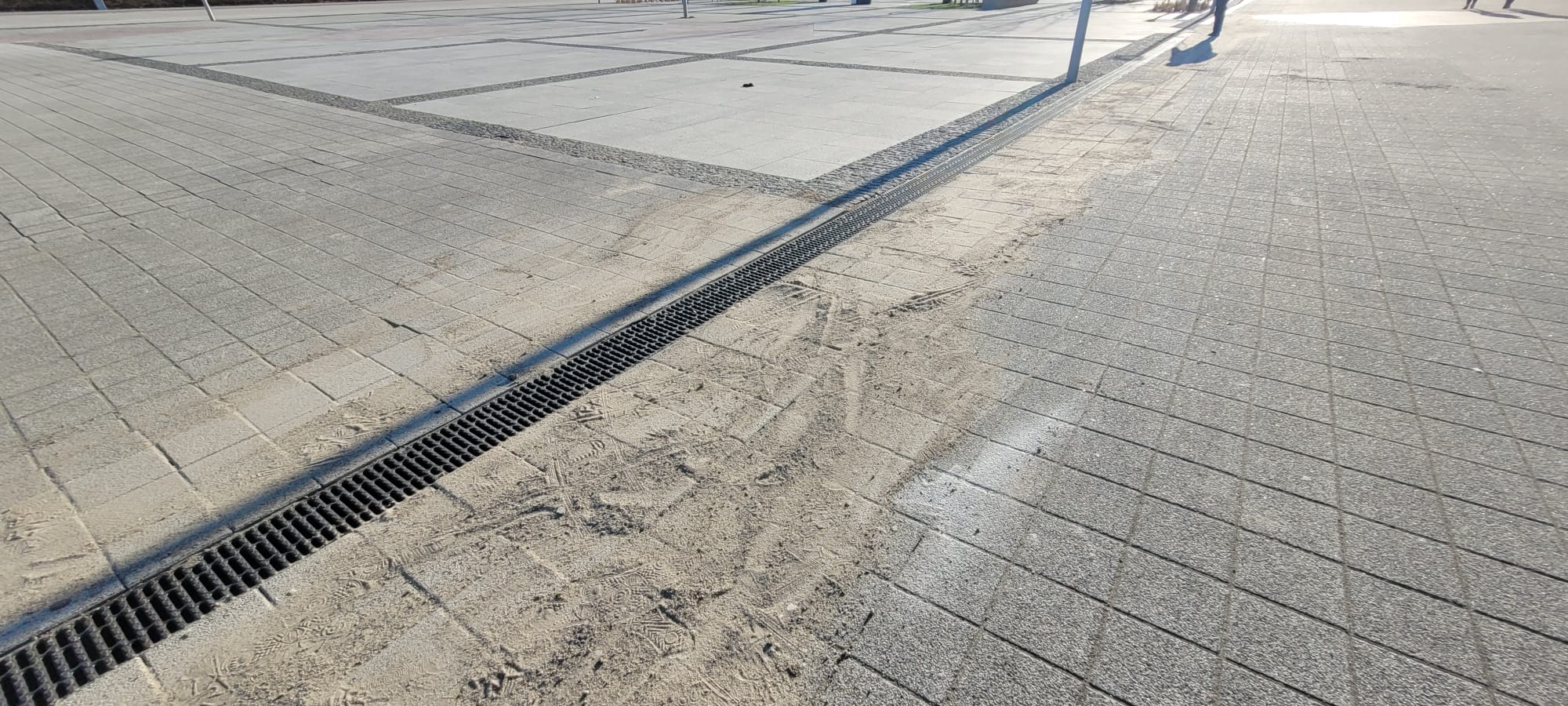 • ubytki podsypki piaskowej widoczne w obrębie odwodnienia liniowego, z wyraźnym wymywaniem materiału;