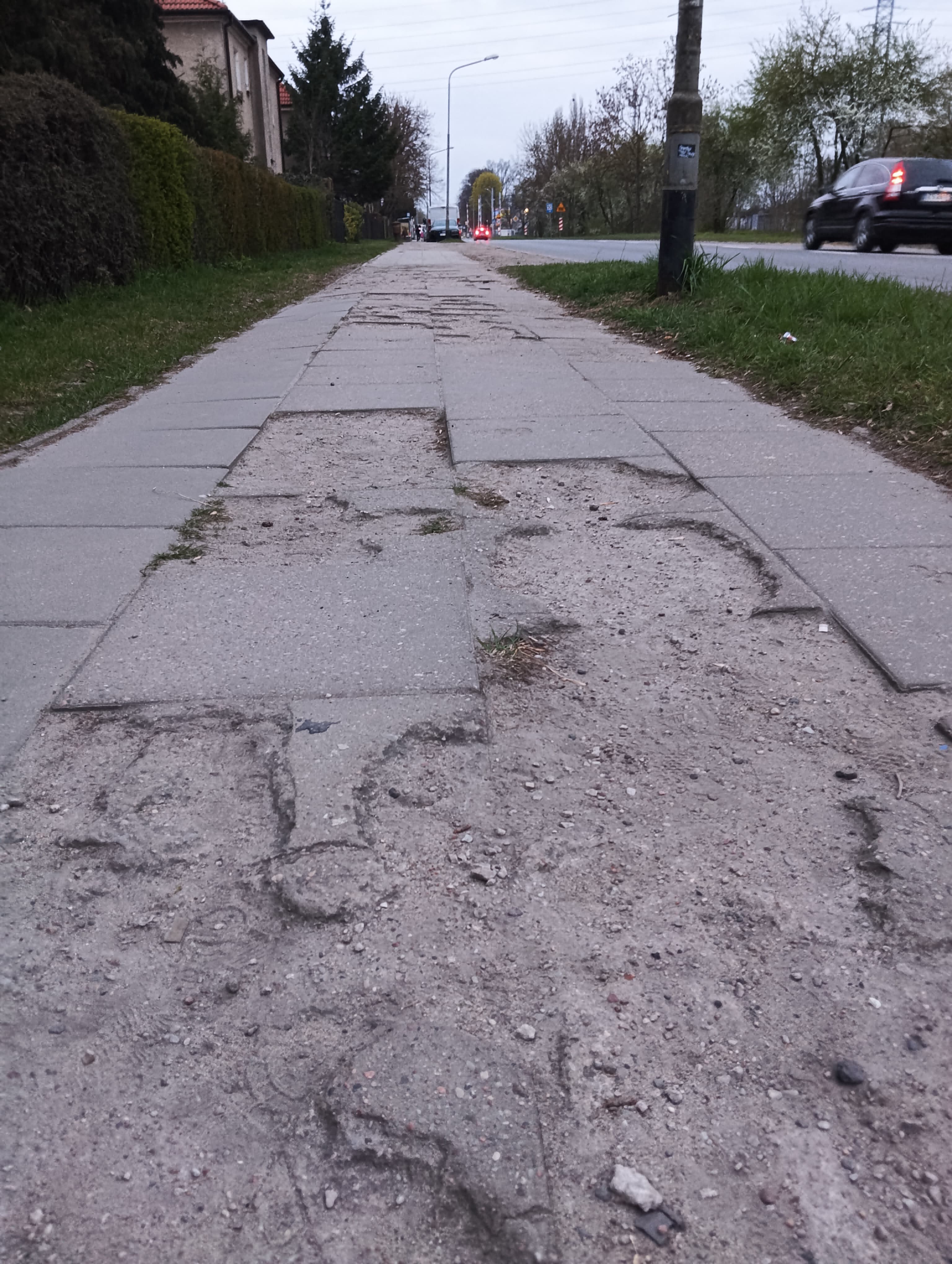 Wskazany fragment chodnika znajduje się w bardzo złym stanie technicznym, występują koleiny, nierówności oraz krzywe i zapadnięte płyty chodnikowe. Taki stan nawierzchni znacząco utrudnia bezpieczne poruszanie się pieszym.