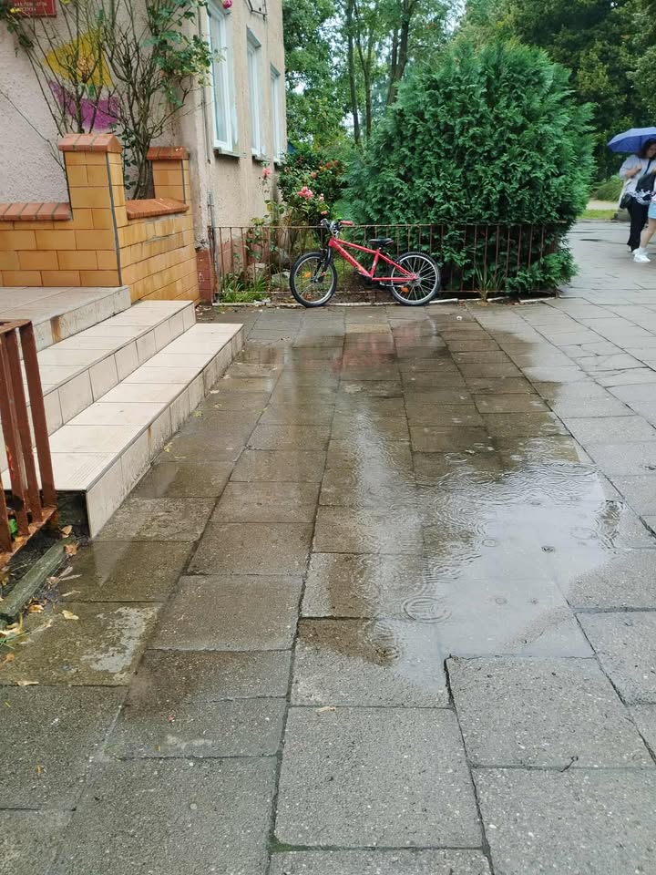 Z punktu widzenia bezpieczeństwa dzieci oraz standardów dostępności, zasadne jest doraźne zabezpieczenie dojścia (wyrównanie zapadliny, uzupełnienie podbudowy i nawierzchni) oraz działanie docelowe: prawidłowe ukształtowanie spadków, odwodnienie liniowe lub punktowe (z włączeniem do istniejącej kanalizacji deszczowej), ewentualna wymiana zdegradowanych elementów nawierzchni i krawędzi. Wskazane jest również przeprowadzenie przeglądu drożności wpustów i odcinka kanału deszczowego w rejonie wejścia. Równolegle warto rozważyć poprawę dostępności (wygładzenie progów, właściwe najazdy dla wózków dziecięcych i osób z niepełnosprawnościami, bezpieczne wyprowadzenie spadków).