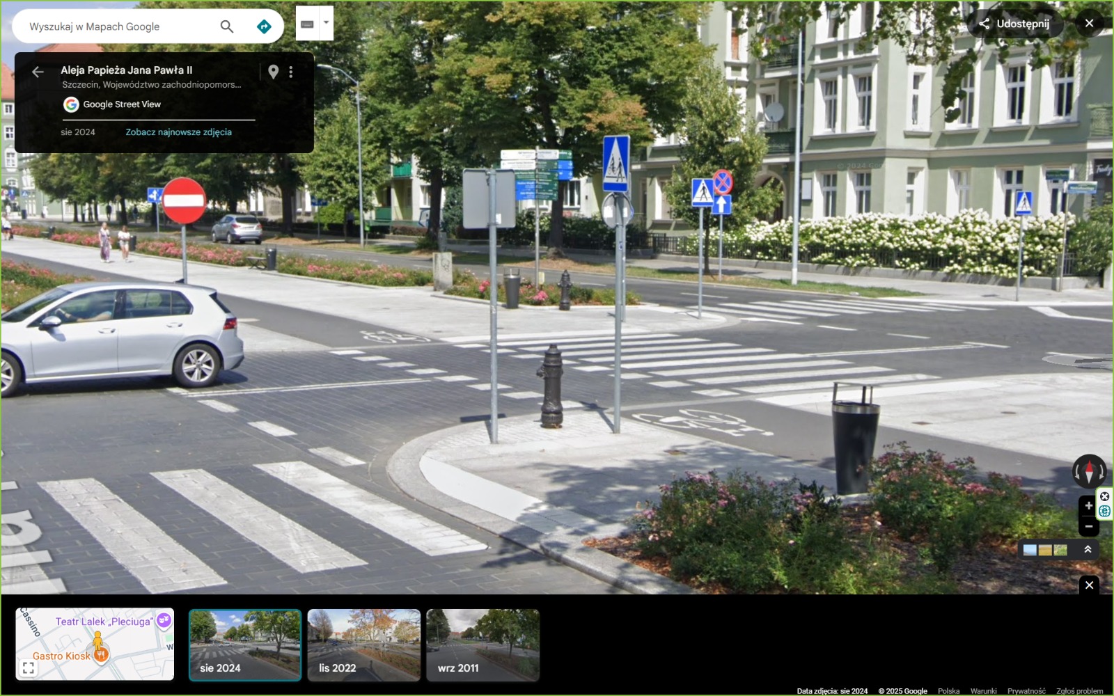 W powyższej lokalizacji znajduje się znak B-33 ograniczający prędkość do 30 km/h, ustawiony wyłącznie po lewej stronie jezdni. Z moich ustaleń wynika, że znak ten został najprawdopodobniej pozostawiony po prowadzonych wcześniej pracach remontowych lub czasowej zmianie organizacji ruchu. Analiza zdjęć dostępnych w usłudze Google Street View (zrzuty ekranu załączam) wskazuje, że w sierpniu 2024 r. znak B-33 w tej lokalizacji nie występował, natomiast w październiku 2024 r. był już ustawiony, przy czym brak jest w usłudze Google Street View widocznych śladów robót drogowych uzasadniających jego wprowadzenie w stałej organizacji ruchu (co nie znaczy wcale, że wprowadzono go niepotrzebnie). Może on jednak stanowić pozostałość po pracach, o których w sposób lakoniczny informował Zarząd Dróg i Transportu Miejskiego w komunikacie z dnia 2 września 2024 r., dotyczącym czasowego wyłączenia przystanku „Urząd Miasta” (https://wiadomosci.szczecin.eu/artykul/komunikacja/przystanek-urzad-miasta-12511-wylaczony).