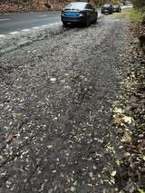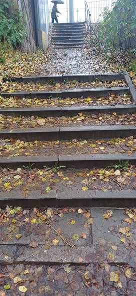 3. Chodnik wzdłuż ul. Włościańskiej (numery parzyste, między ulicą a parkingiem) oraz zejście z ul. Boryny do garaży (naprzeciwko plebanii) na ul. Włościańską – mieszkańcy wskazują, że miejsca te są „zasypane liśćmi”. W czasie deszczu jest tam bardzo ślisko, co przy pochyłościach terenu i zejściach zwiększa ryzyko upadków, szczególnie u osób starszych.