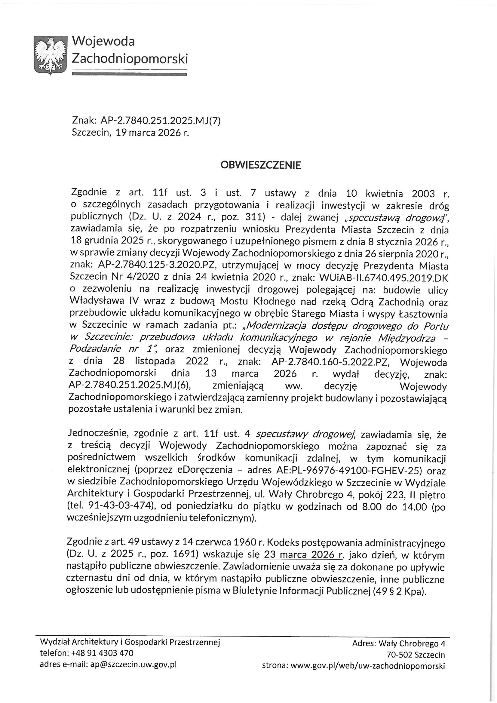Obwieszczenie Wojewody Zachodniopomorskiego o wydaniu decyzji w dniu 13 marca 2026 r. decyzji znak: AP-2.7840.251.2025.MJ(6), zmieniającej decyzję WZ z dnia 26 sierpnia 2020 r.