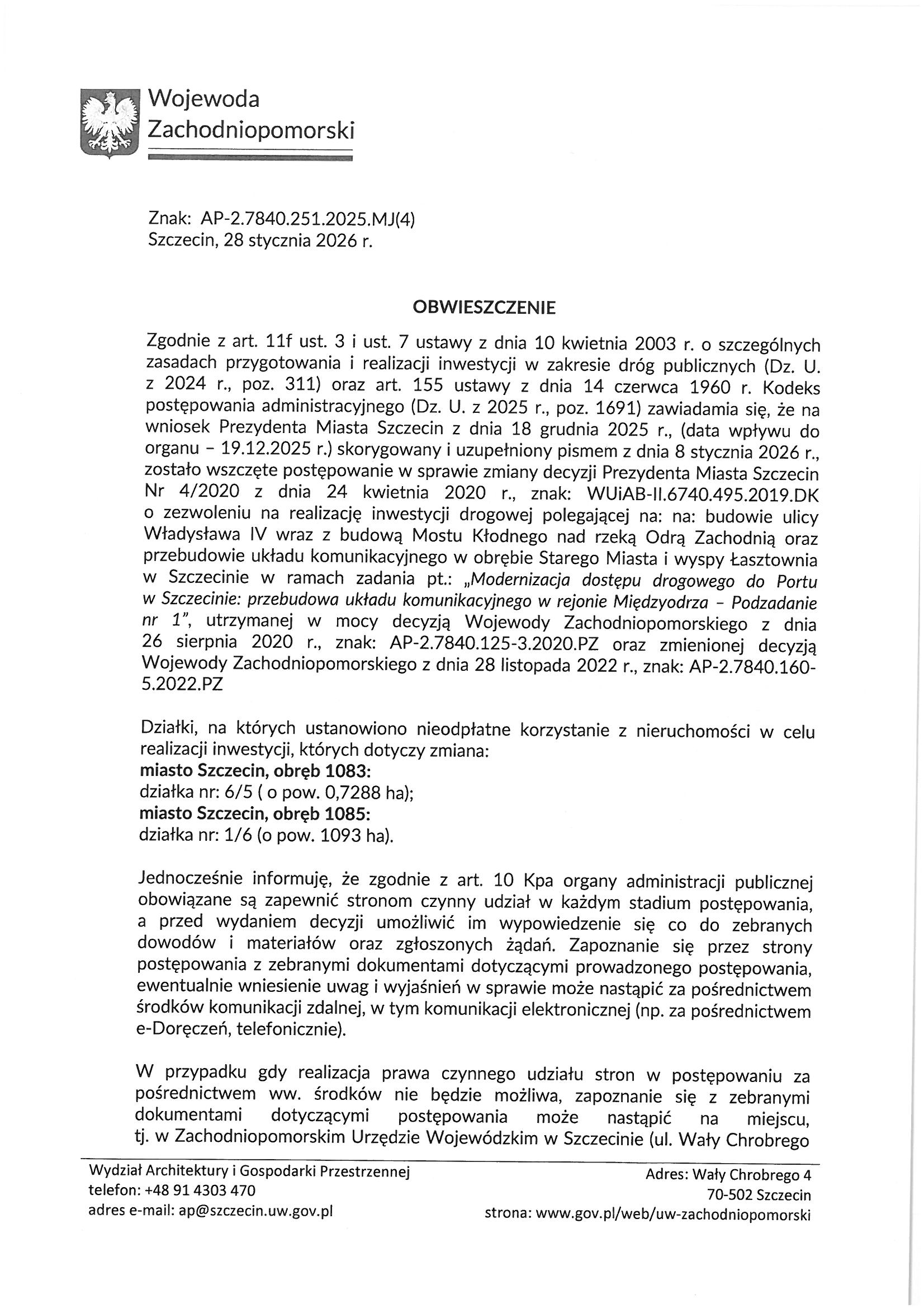 Obwieszczenie Wojewody Zachodniopomorskiego w sprawie zmiany decyzji Prezydenta Miasta Szczecin Nr 4/2020 z dnia 24 kwietnia 2020 r., znak: WUiAB-II.6740.495.2019.DK o zezwoleniu na realizację