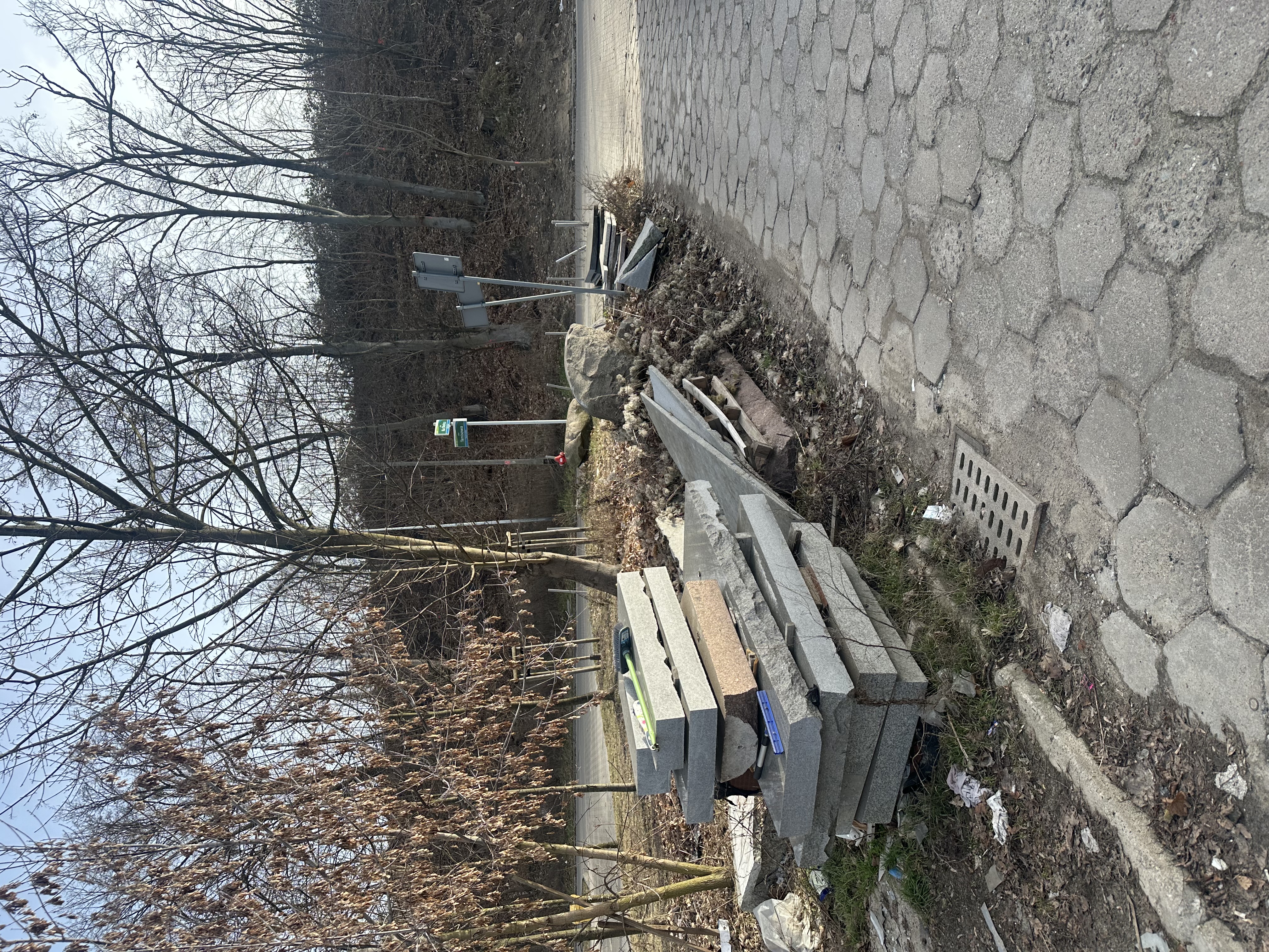 Na poboczach oraz części jezdnej składowane są płyty kamienne, elementy betonowe, odpady budowlane, opakowania po chemikaliach oraz inne nieczystości. Materiały te są rozrzucone również w rejonie przejścia na osiedle, co nie tylko negatywnie wpływa na estetykę przestrzeni publicznej, ale przede wszystkim stwarza zagrożenie dla bezpieczeństwa pieszych i kierowców. Teren sprawia wrażenie niekontrolowanego składowiska odpadów.