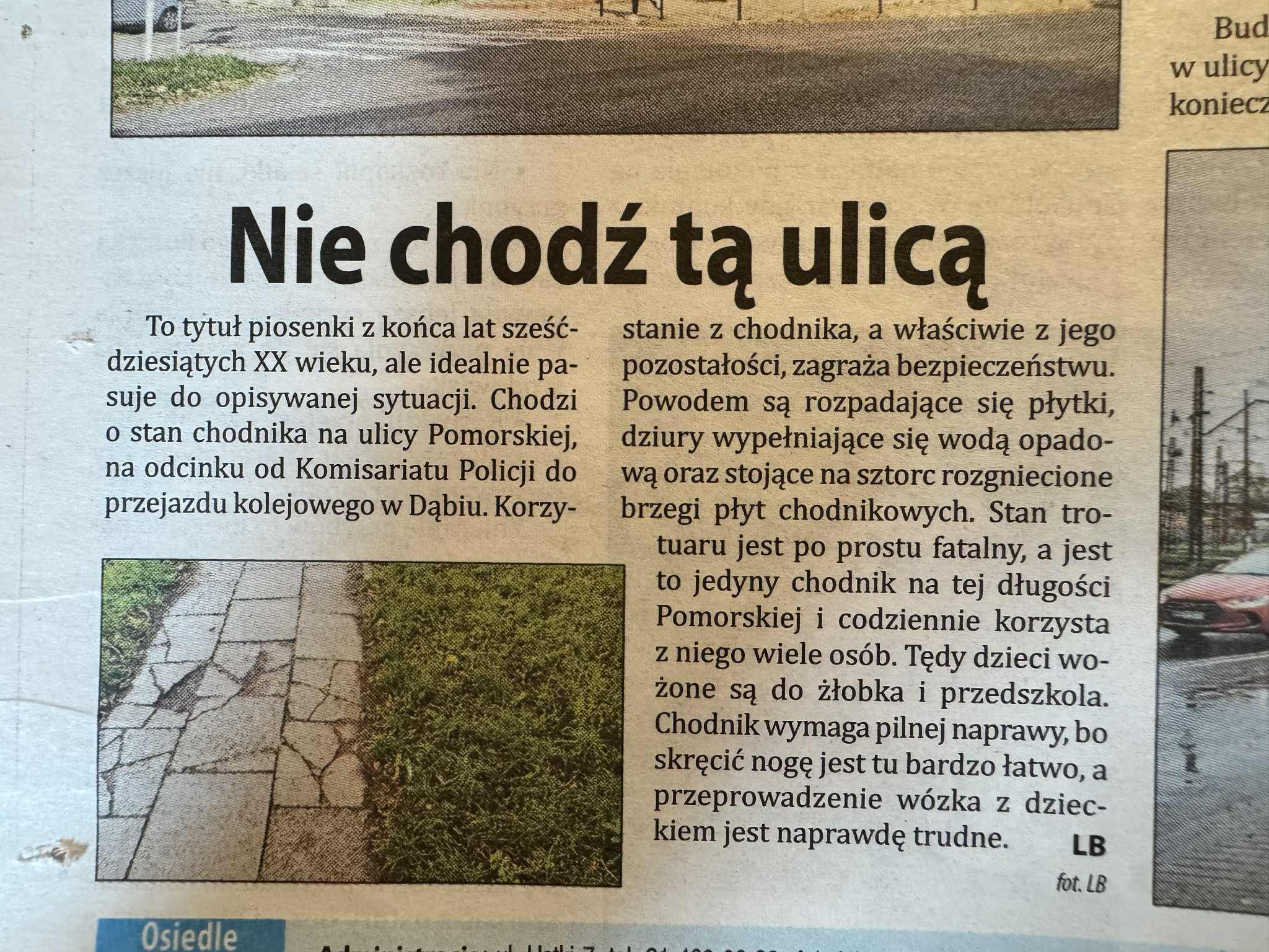 zwracam się z uprzejmą prośbą o naprawę nawierzchni chodnika na ul. Pomorskiej, na odcinku od Komisariatu Policji do przejazdu kolejowego.