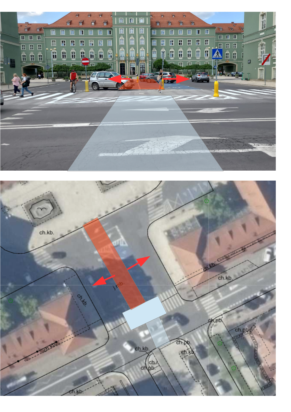 Kolorem błękitnym oznaczyłem projektowane przejście dla pieszych, pomarańczowym przewidywany ciąg pieszy doprowadzający pieszych do dziedzińca pl. Armii Krajowej najprostszą drogą, kolorem błękitnym nieprzezroczystym widoczne już na zdjęciu wyznaczone pole dla pieszych pomiędzy nowo wytyczonymi przejściami dla pieszych.
