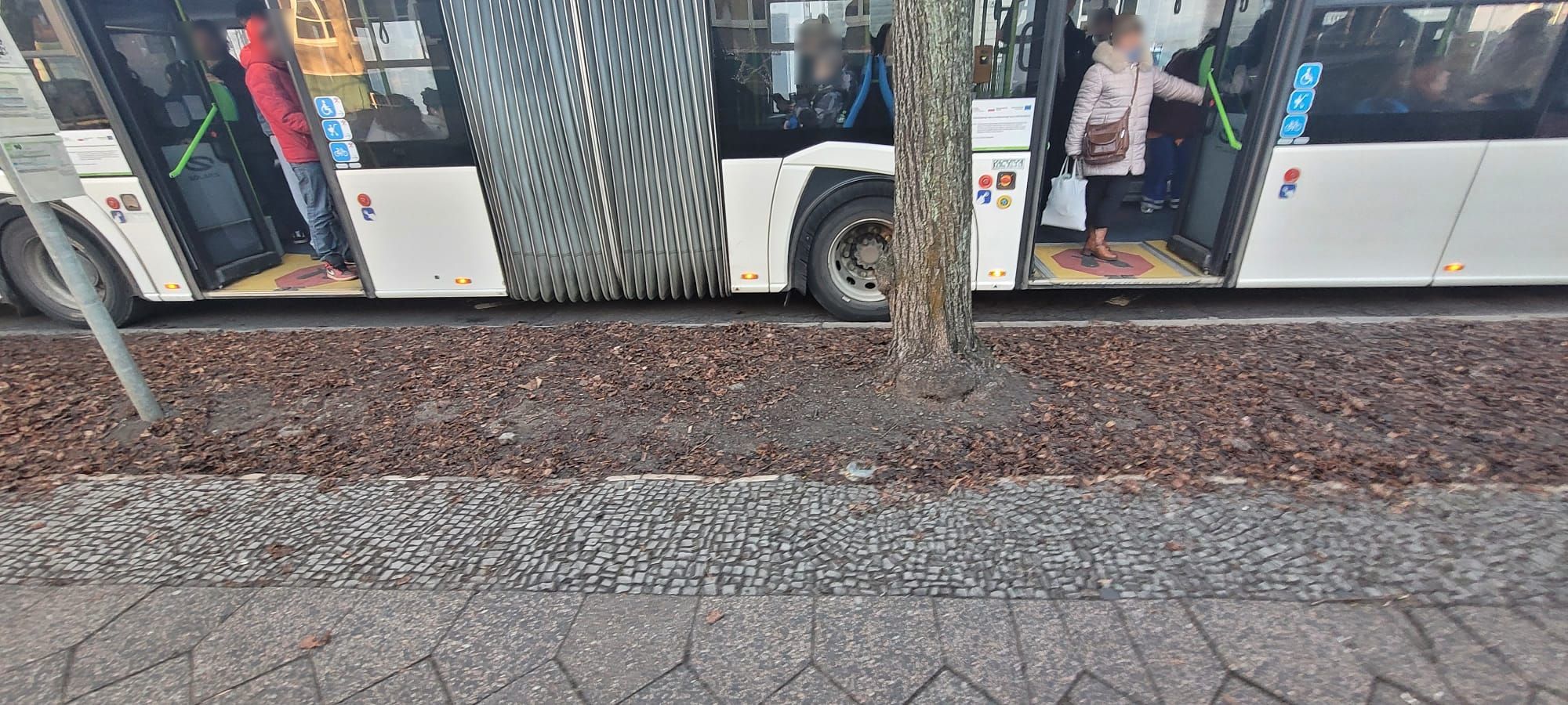 Pasażerowie wysiadający z autobusów – w większym stopniu po prawej stronie jezdni w kierunku Alei Wojska Polskiego (przystanek 12321), ale też po przeciwnej stronie ulicy (przystanek 12322) – zmuszeni są do korzystania z nieutwardzonej nawierzchni. W okresach jesienno-zimowych powierzchnia ta jest dodatkowo pokryta opadłymi liśćmi, co przy zwiększonej wilgotności oraz opadach atmosferycznych stwarza realne zagrożenie dla bezpieczeństwa pieszych. Problem ten ma charakter nie tylko estetyczny, lecz przede wszystkim dotyczy bezpieczeństwa użytkowników transportu publicznego. Przystanki nie są ponadto wyposażone ani w ławki, ani ty, bardziej we wiaty przystankowe.